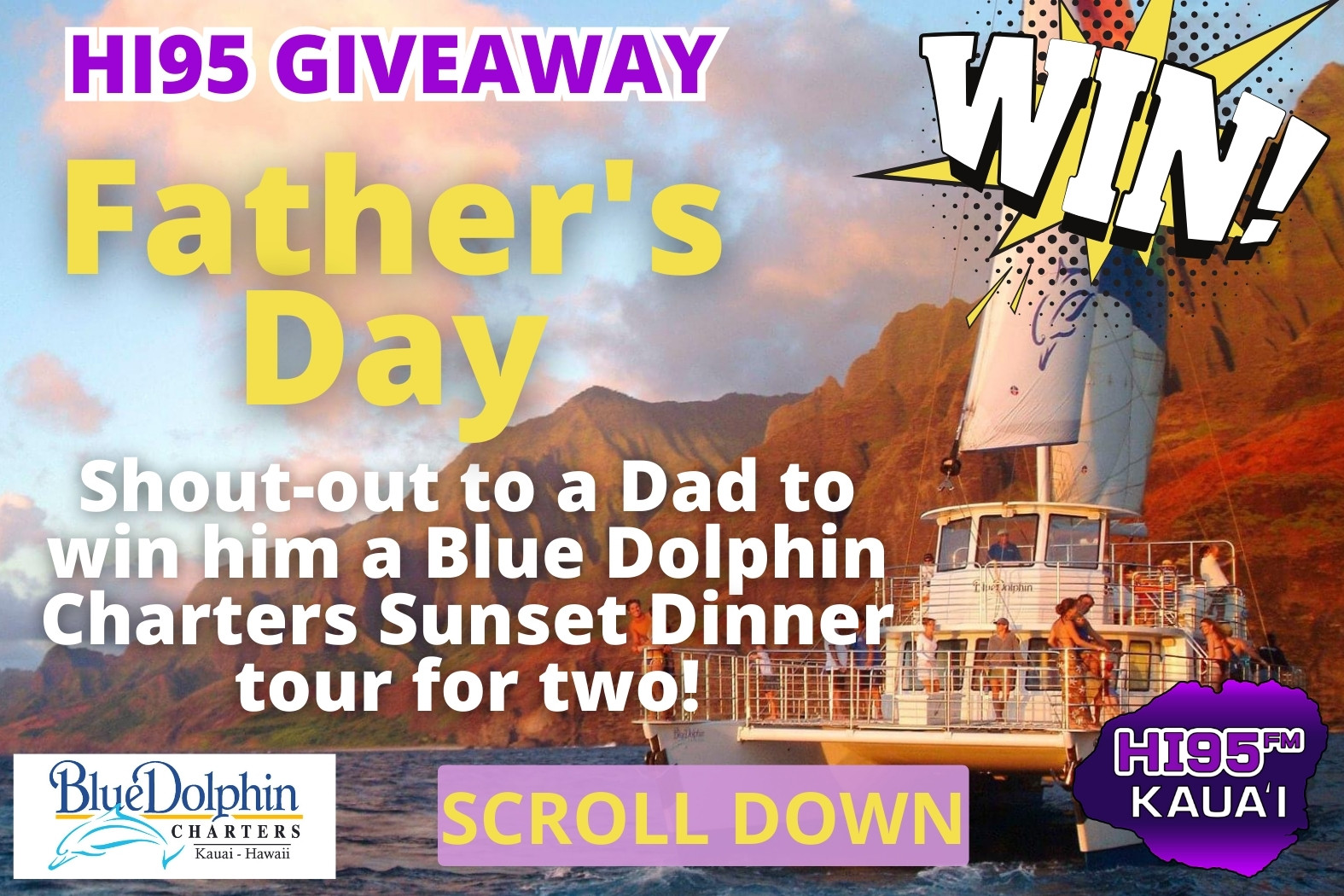 HI95 is saluting all Kauaʻi Dads this week, just in time for Father’s Day this Sunday! And we’re giving them a chance to win a 4-hour Nā Pali Coast Sunset Dinner Cruise for Two with Blue Dolphin Charters. All you gotta do is send a shout-out to a Kauaʻi Dad and he’ll be entered to win!
