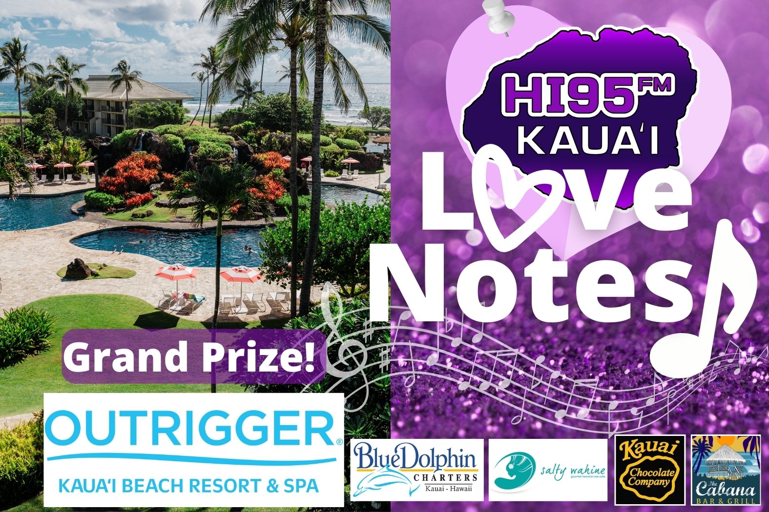 It’s the return of HI95’s Love Notes! Phone in a shout-out or song dedication to your loved one by calling the HI95 Studio or by submitting a LOVE NOTE online at hi95kauai.com using the form below. Daily prizes will be given away all Valentine’s Week, from randomly selected entries received. Your loved one will also be entered to win the HI95 Love Notes Grand Prize of a 2-night stay at the OUTRIGGER Kauaʻi Beach Resort and Spa in a newly renovated Ocean View Signature Room, the perfect romantic getaway!
